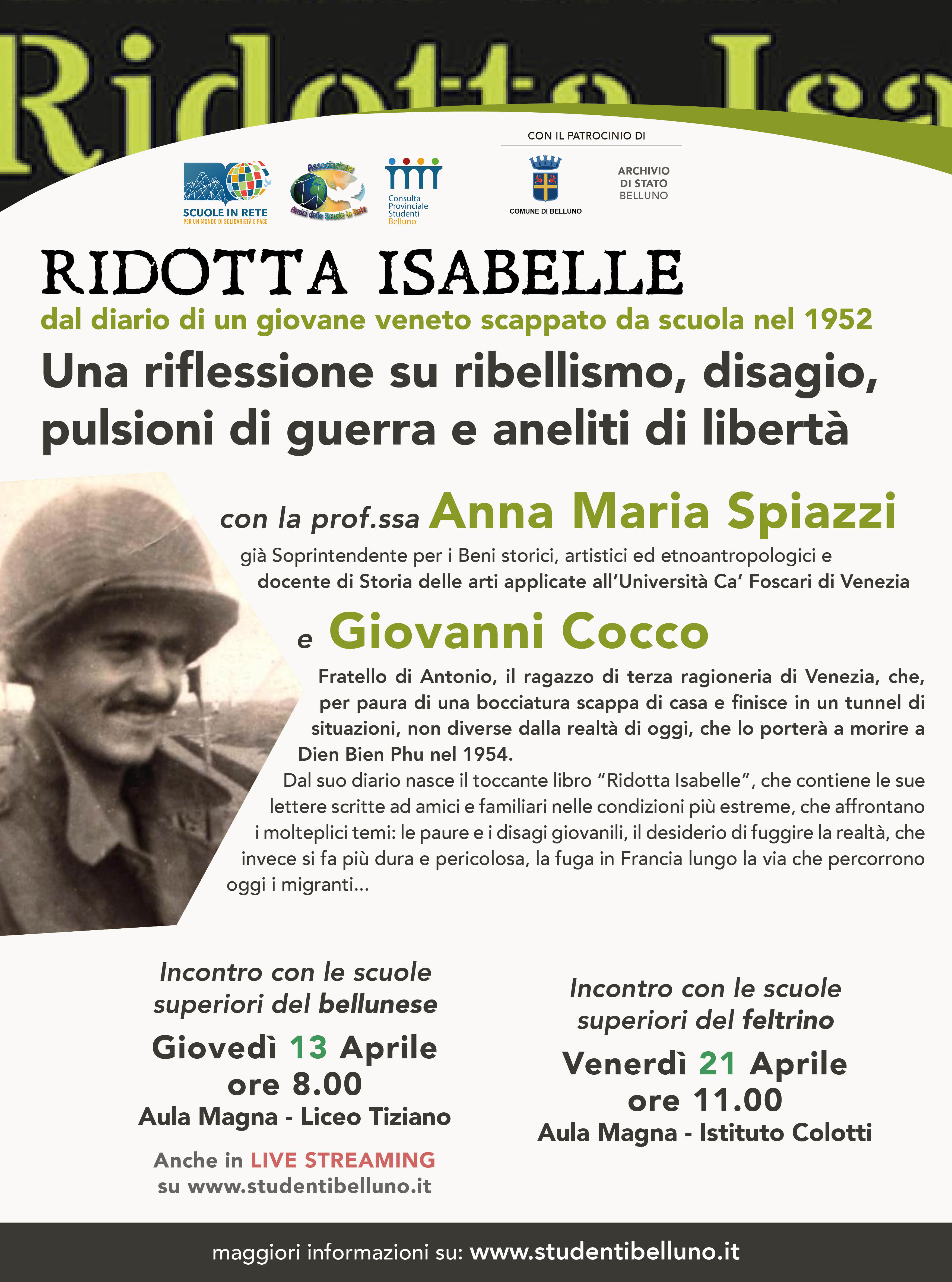 Ridotta Isabelle - dal diario di un giovane veneto scappato da scuola nel 1952 una riflessione su ribellismo, disagio, pulsioni di guerra e aneliti di libertà – incontro con Giovanni Cocco e Anna Maria Spiazzi - 13 e 21 aprile 2023