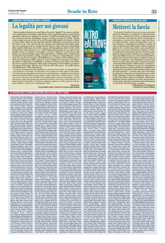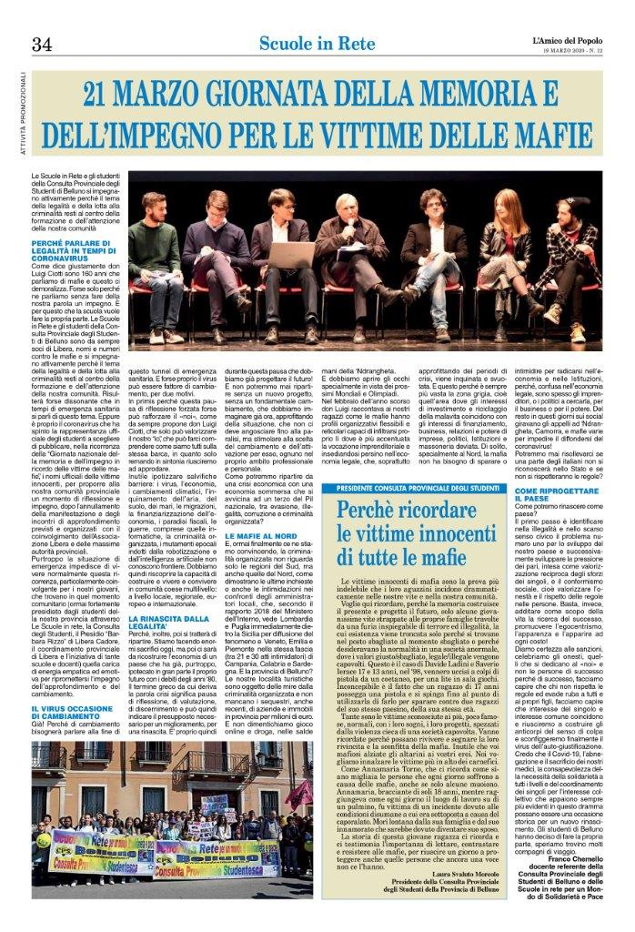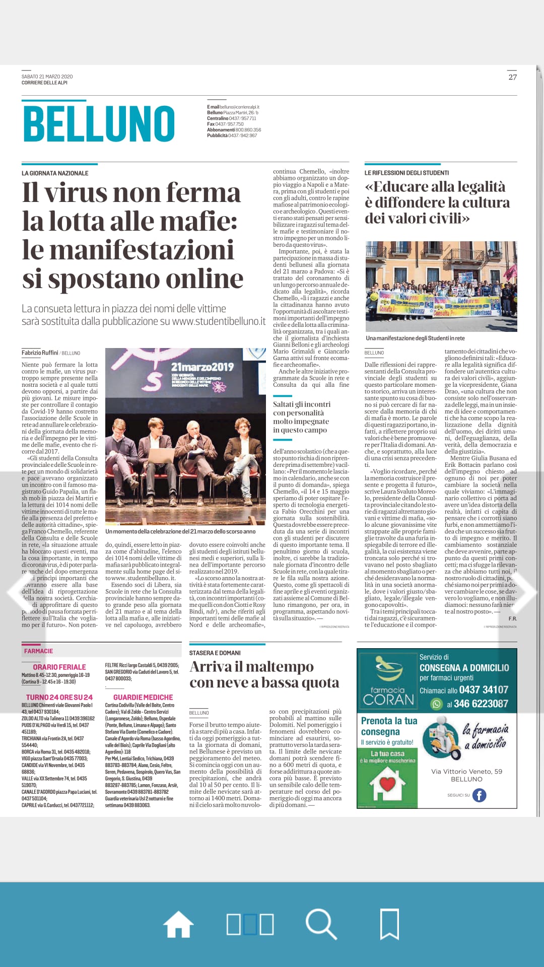 Non potendo organizzare una grande manifestazione a Belluno con altre iniziative collaterali previste, la Consulta Provinciale degli Studenti e le Scuole in rete hanno deciso di celebrare le vittime di tutte le mafie e di promuovere per tutta la cittadinanza il tema della legalità, centrale per la rinascita del nostro paese dopo l'emergenza coronavirus, attraverso i mass media e i social.