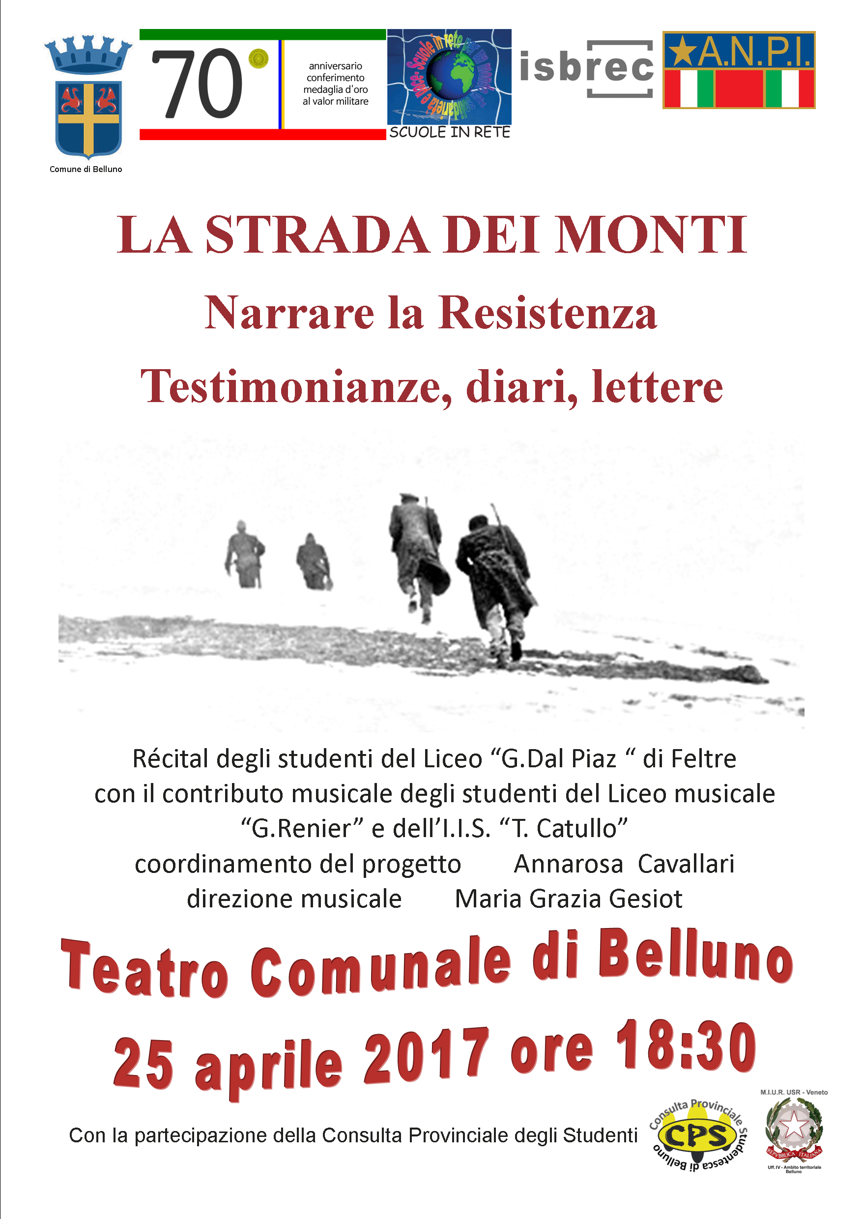 All’interno delle celebrazioni per il Settantesimo del conferimento della medaglia d’oro al valor Militare alla città di Belluno, l’Amministrazione comunale in sinergia con l’ANPI, l’ISBREC, la Fondazione Teatri delle Dolomiti, Le Scuole in Rete, La Consulta Provinciale degli Studenti organizzano nella giornata del 24 aprile alle ore 10:30 e il 25 aprile ore 18:30 presso il Teatro Comunale di Belluno la presentazione dello spettacolo La Strada Dei Monti. Narrare la Resistenza: testimonianze, diari, lettere 8 settembre '43 - 25 aprile '45
