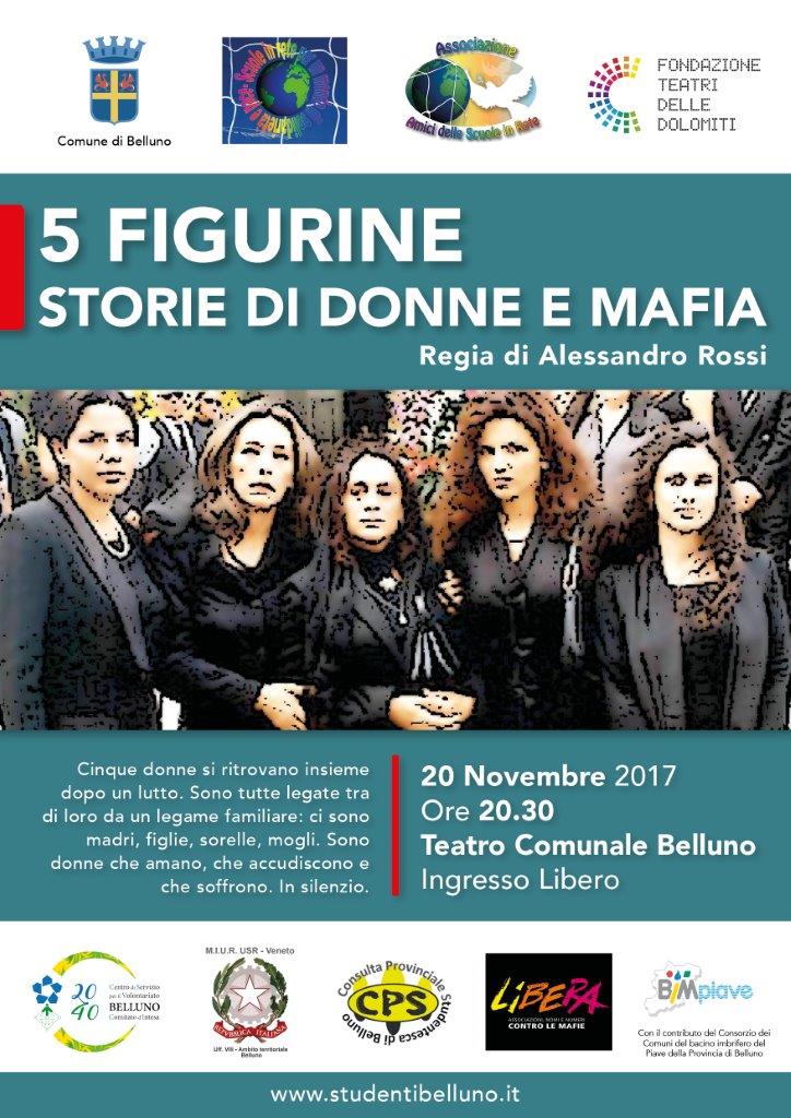 "5 figurine" è una messa in scena tutta al femminile che trae ispirazione da diversi testi che raccontano le esperienze delle donne che con la mafia hanno convissuto e combattuto. E' un lavoro che prova a raccontare i sentimenti di 5 donne legate tra di loro da un "cordone familiare", che non si può spezzare e che utilizzando le tecniche del teatro gioca tra la realtà e la finzione.