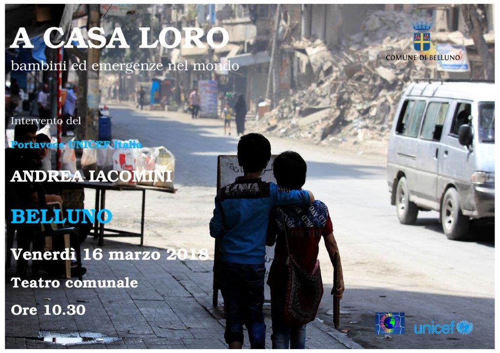 Andrea Jacomini, portavoce Unicef: A Casa Loro, bambini ed emergenze nel mondo in collaborazione con Comune di Belluno, Unicef e i rappresentanti di istituto dell'I.I.S.Segato-Brustolon. Presso Teatro Comunale di Belluno ore 10:30-12:30