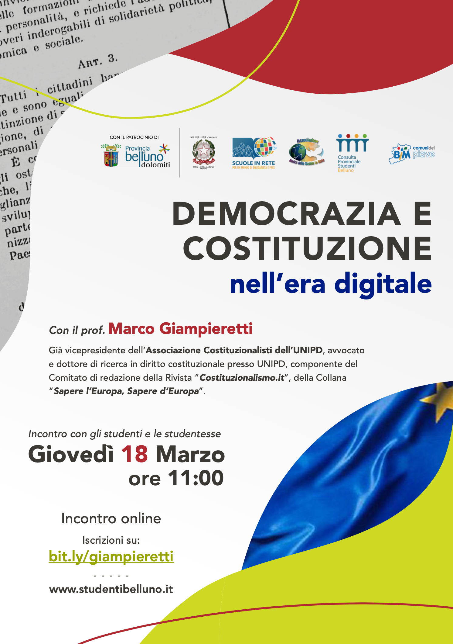 Incontro degli studenti delle Superiori con il dott. Marco Giampieretti, già vicepresidente dell'Associazione Costituzionalisti dell'UNIPD, avvocato e dottore di ricerca in diritto costituzionale presso UNIPD, componente del Comitato di redazione della Rivista “Costituzionalismo.it", della Collana "Sapere l’Europa, Sapere d’Europa". L’evento è organizzato in sinergia con l’Associazione Amici delle Scuole in Rete e lo scrivente Ufficio.