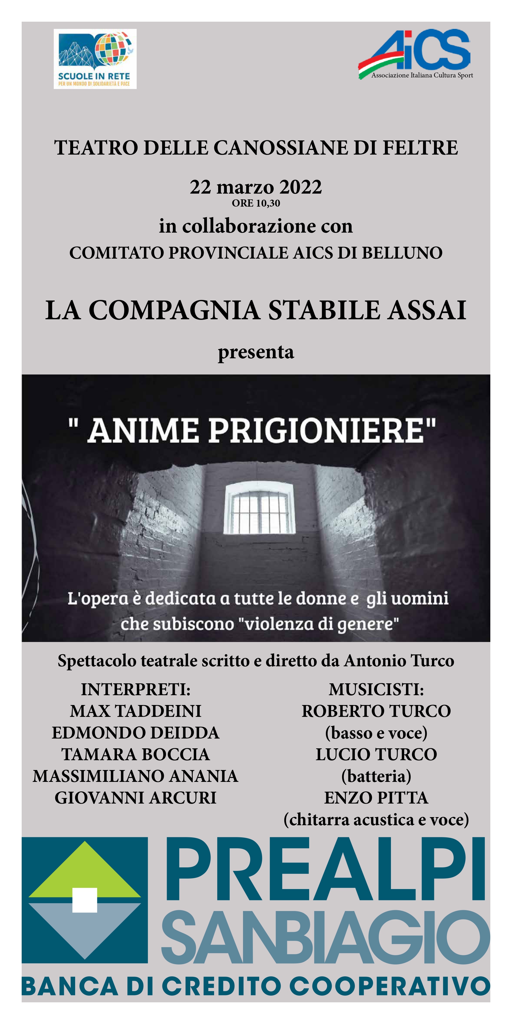 l’AICS in collaborazione con le Scuole in Rete per un Mondo di Solidarietà e Pace organizza il 22 marzo dalle ore 11:00 alle 12:50 uno spettacolo gratuito della Compagnia stabile Assai presso l’Auditorium dell’Istituto Canossiano di Feltre dal titolo “Anime prigioniere”.