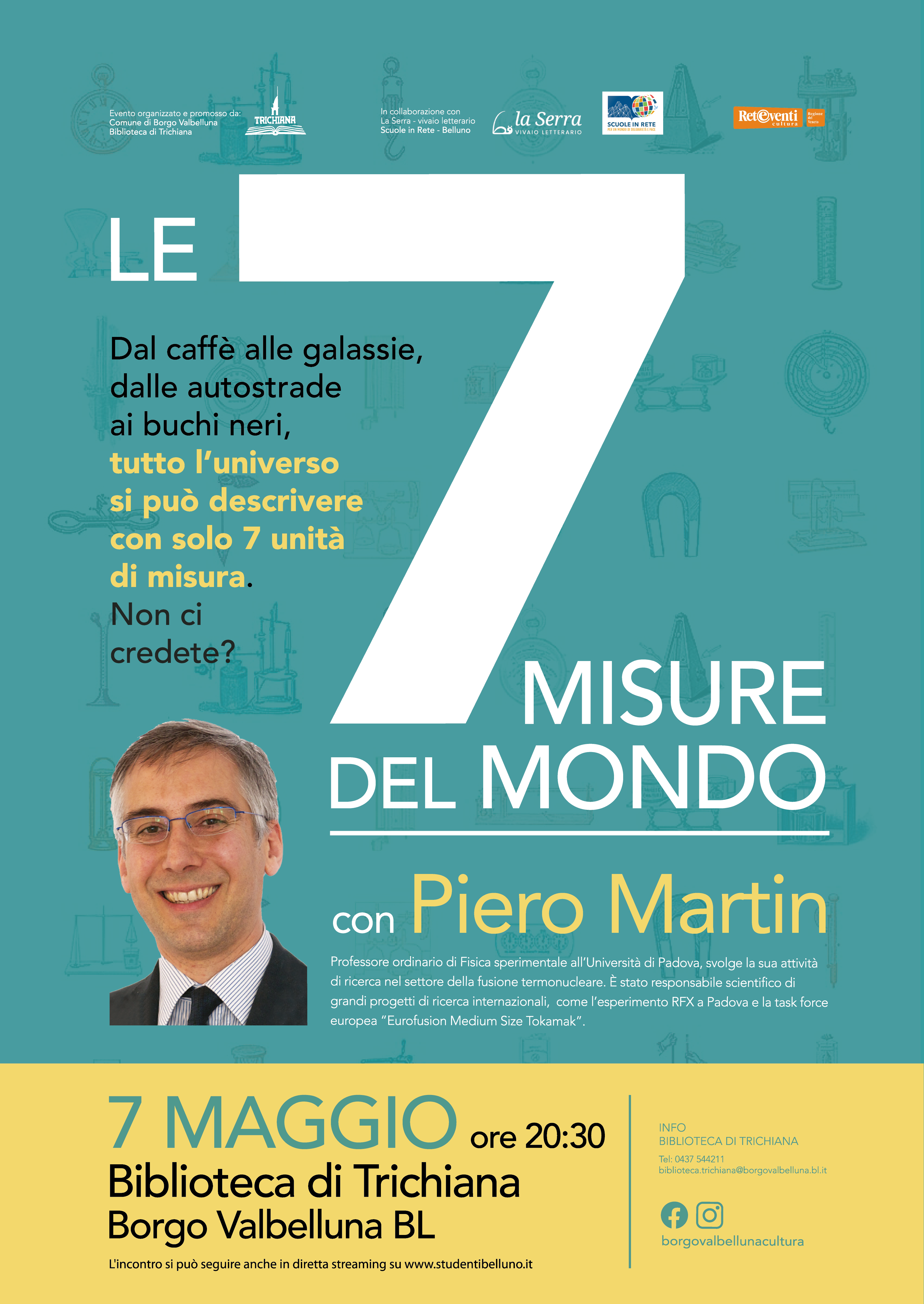 Sabato 7 maggio alle 20:30 nella Biblioteca comunale di Trichiana di Borgo Valbelluna l'Amministrazione Comunale di Borgo organizza la presentazione del libro “Le 7 misure del mondo”, edito da Laterza. L’autore, Piero Martin, insegna fisica sperimentale all’Università di Padova. È un popolare divulgatore scientifico che racconta la scienza alla radio, in televisione e in numerosi eventi pubblici.