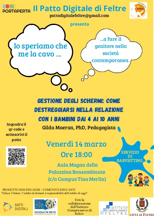 Organizzato dai genitori del patto di Feltre in collaborazione con le Scuole in Rete e l'Associazione Amici delle Scuole in rete all'interno del progetto PROGETTO 2020-EDU-02203 - COMUNITÀ EDUCANTI “Educa il futuro: l’adulto di domani è responsabilità dell’adulto di oggi”